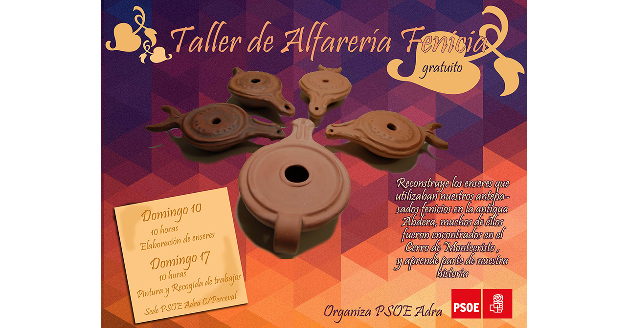 La Ejecutiva Local del PSOE de Adra ha organizado un taller de alfarería fenicia con el que dará a conocer a los más pequeños del municipio los hallazgos históricos de la época enseñándoles a reconstruir diferentes enseres hallados en el Cerro Montecristo del municipio, que se utilizaban en la antigua Abdera.