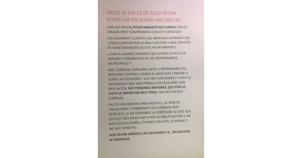 La concejala del PSOE en el Ayuntamiento de Almería, Inés Plaza, ha traslado las quejas de los comerciantes y usuarios del Mercado Central debido a que la escalera mecánica que une las dos plantas lleva rota, sin posibilidad de uso en uno de los sentidos, desde el pasado 13 de julio, por lo que esta semana se entra en la tercera con esa situación. “Exigimos que se arregle cuanto antes y que, de una vez por todas, el equipo de gobierno del Partido Popular aprenda y se responsabilice del mantenimiento específico de este emblemático espacio con agilidad”, ha remarcado la edil antes de recordar que, recientemente, “los comerciantes y clientes también tuvieron que aguantar más de ocho semanas con una de las puertas de acceso rotas”.