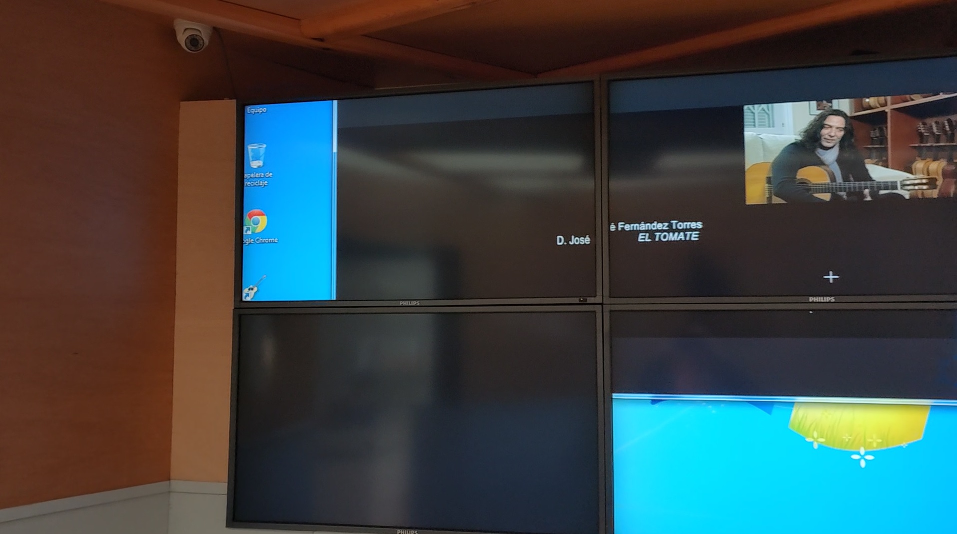 Además, hay dos proyectores que deberían estar emitiendo imágenes sobre cómo se elabora una guitarra, que tampoco funcionan, y, de las seis pantallas que componen el videowall, donde tendría que proyectarse un documental sobre la vida y la obra de Antonio de Torres, una está apagada y el resto funcionan mal, con imágenes entrecortadas en las que puede verse hasta el panel de control de windows.