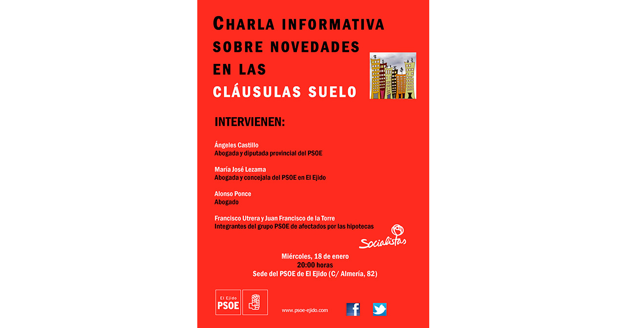 La sede del PSOE de El Ejido acogerá el próximo miércoles, a partir de las ocho de la tarde, una charla sobre las últimas novedades en las cláusulas suelo. En este encuentro, abierto al público, participarán tres abogados expertos en la materia, Ángeles Castillo, diputada provincial del PSOE; la concejala socialista ejidense María José Lezama; y el asesor jurídico de la agrupación socialista de El Ejido, Alonso Ponce. Junto a ellos, también participarán dos integrantes del grupo del PSOE de afectados por las hipotecas, Francisco Utrera y Juan Francisco de la Torre.