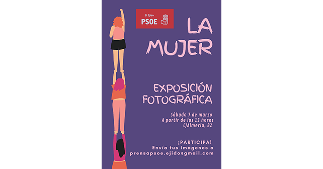 El PSOE de El Ejido ya prepara una intensa jornada para conmemorar el próximo 8 de marzo, Día de la Mujer, y adelantará un día su celebración con la realización de varias actividades para las que desde las filas socialistas se anima a la participación de todos y todas las ejidenses. Así, una de las principales iniciativas que se van a llevar a cabo en esta jornada feminista que tendrá lugar el sábado 7 de marzo, a partir de las 12 horas desde la sede del PSOE de El Ejido (Calle Almería, 82), consistirá en la presentación de una muestra fotográfica que tiene como único tema ‘La Mujer’.