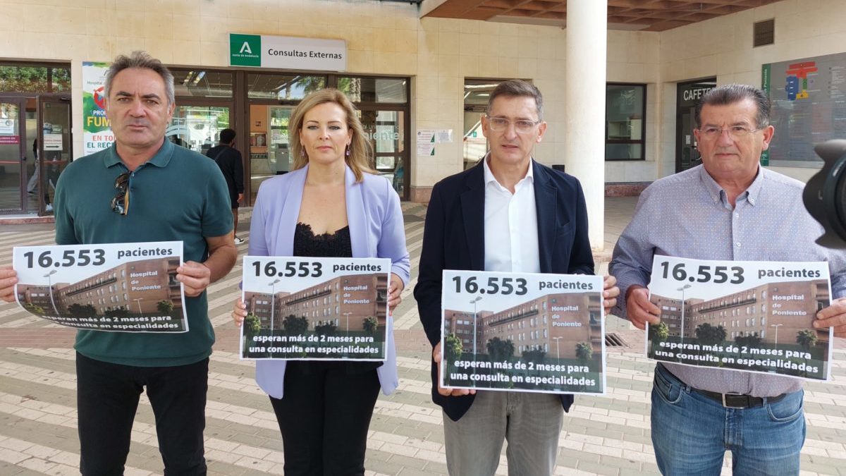 El PSOE de Almería ha denunciado hoy la saturación que sufren las consultas externas del Hospital de Poniente y que han llevado a este centro a colocarse a la cabeza de los hospitales comarcales de toda Andalucía en número de pacientes en lista de espera que han superado el plazo de dos meses establecido en el decreto de garantía de plazos de respuesta sanitaria. En concreto, en el Hospital de Poniente existen 16.553 pacientes que llevan esperando más de dos meses para una consulta con un médico especialista, según los últimos datos oficiales disponibles. Estas cifras han sido difundidas hoy por el parlamentario del PSOE de Almería José Luis Sánchez Teruel, quien ha comparecido a las puertas del hospital, junto a portavoces y concejales socialistas de varios municipios del Poniente.