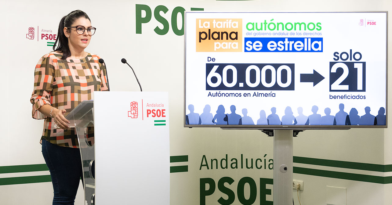 La parlamentaria andaluza del PSOE de Almería, Noemí Cruz Martínez, ha desvelado esta mañana en rueda de prensa que tan sólo 21 de las 60.000 personas que trabajan actualmente en la provincia por cuenta propia han recibido las ayudas del denominado Programa de Estímulo a la creación y consolidación del Trabajo Autónomo en Andalucía que anunció el Gobierno de las derechas como medida estrella aunque, más bien, dicha iniciativa “se ha estrellado tanto en Almería como en Andalucía”, ha observado.