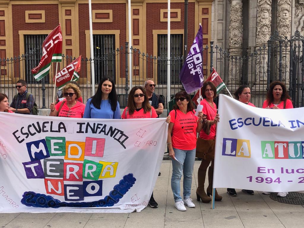 Cruz ha acompañado a las trabajadoras afectadas en la concentración que han realizado hoy frente al Palacio de San Telmo, sede del Gobierno andaluz, para exigir una solución a la precaria situación en la que han quedado, ya que la Junta de Andalucía no las ha subrogado pero tampoco reconoce su despido, lo que les está impidiendo acceder ni siquiera a la prestación por desempleo.