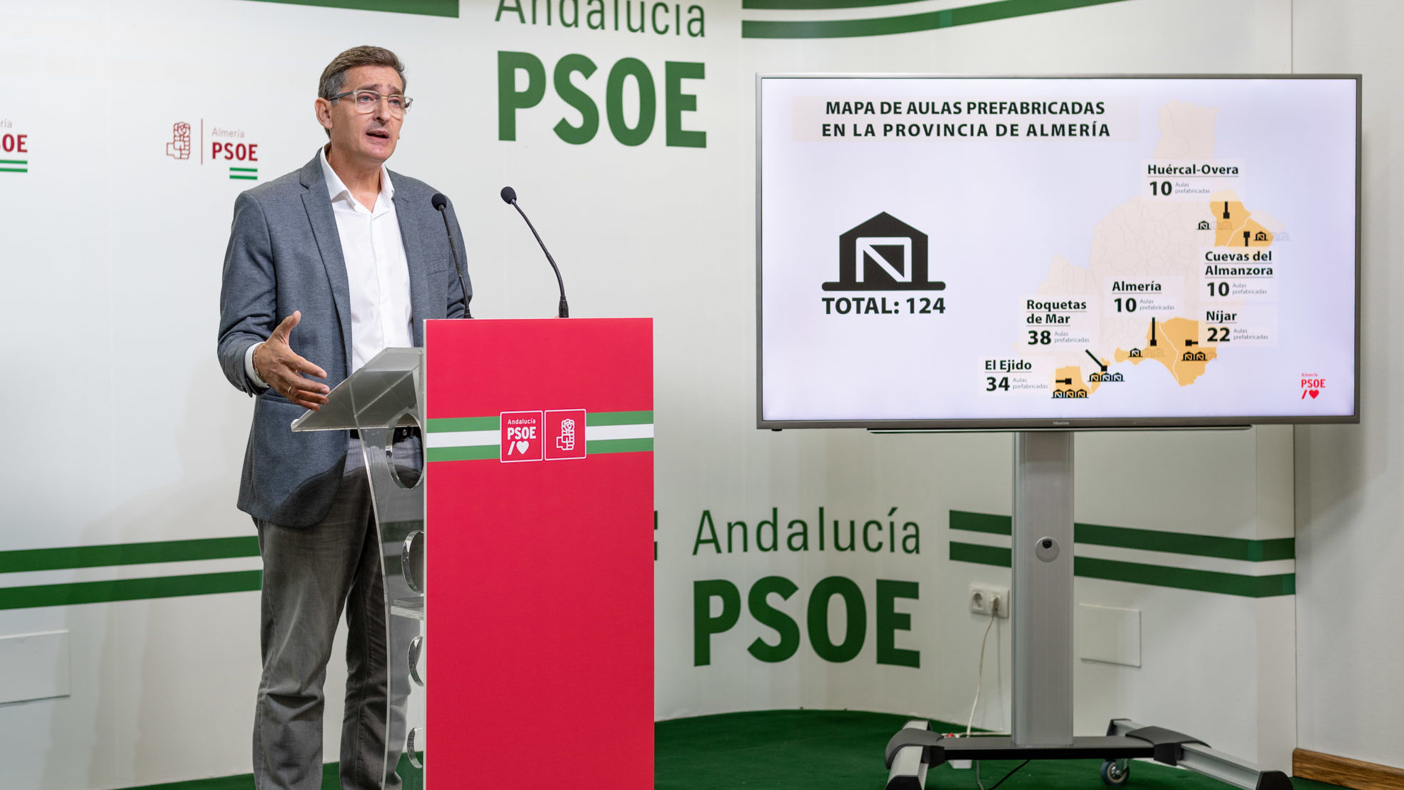 El parlamentario autonómico por el PSOE de Almería José Luis Sánchez Teruel ha dado a conocer esta mañana el mapa de aulas prefabricadas que existen en la provincia de Almería que, como ha dicho, se han duplicado en los últimos cuatro años fruto de la gestión del Gobierno de Moreno Bonilla que, ha lamentado, mantiene “saturado” el sistema educativo público. Según ha podido constatar en las visitas que ha realizado durante el pasado mes a los municipios, existen más de 120 instalaciones provisionales en las que estudian 3.000 escolares y se distribuyen, mayoritariamente, en los municipios de Cuevas del Almanzora (10), Huércal-Overa (10), Níjar (22), Almería (10), Roquetas de Mar (38) y El Ejido (34).