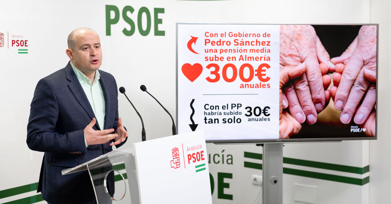 El responsable socialista ha destacado que el impacto de la revalorización de las pensiones, más la conocida como paguilla, supondrá unos ingresos extraordinarios en la economía provincial de 54 millones de euros, “54 millones de euros que Pedro Sánchez pone en los bolsillos de los pensionistas de Almería” y que contrastan con la cantidad que habrían percibido si se hubiera continuado aplicado el sistema de revisión de las pensiones que utilizaba el Gobierno de Mariano Rajoy.