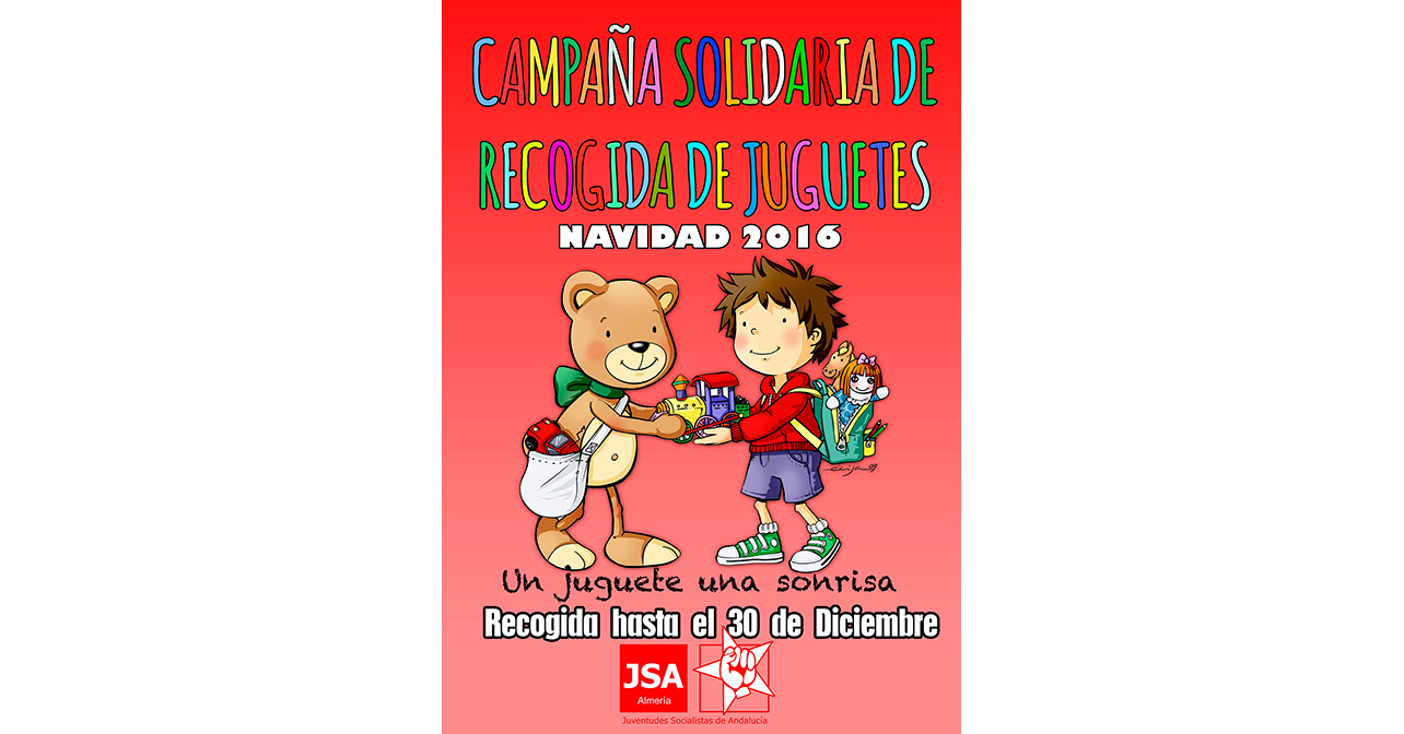 Juventudes Socialistas de Almería ha iniciado la quinta edición de su ya tradicional campaña de recogida de juguetes solidaria bajo el lema “Un juguete, una sonrisa”. Como en campañas anteriores, el secretario general de JSA en la provincia, Ramón Soto, ha explicado que los jóvenes socialistas de toda la provincia se encargarán de recoger “en cada una de sus sedes locales, hasta el día 30 de diciembre, juguetes nuevos o usados en buenas condiciones, que serán entregados a los niños y niñas con menos recursos de toda la provincia”.