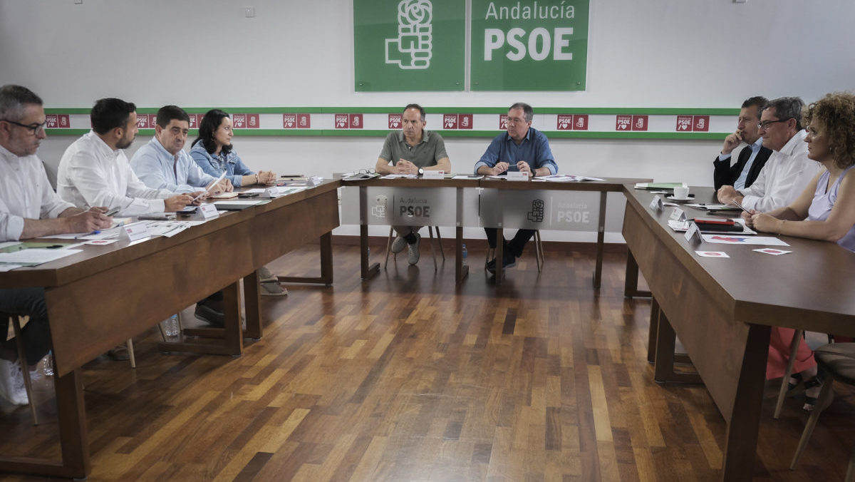 En la reunión mantenida en la mañana de este viernes, 14 de junio de 2024, para evaluar el resultado de las elecciones europeas celebradas el 9 de junio, el secretario general de los socialistas andaluces, Juan Espadas, y los secretarios generales provinciales de Almería, Juan Antonio Lorenzo; Cádiz, Juan Carlos Ruiz Boix; Córdoba, Rafi Crespín; Granada, Pepe Entrena; Huelva, María Eugenia Limón; Jaén, Paco Reyes; Málaga, Dani Pérez, y Sevilla, Javier Fernández, han analizado los datos de cada una de las provincias.