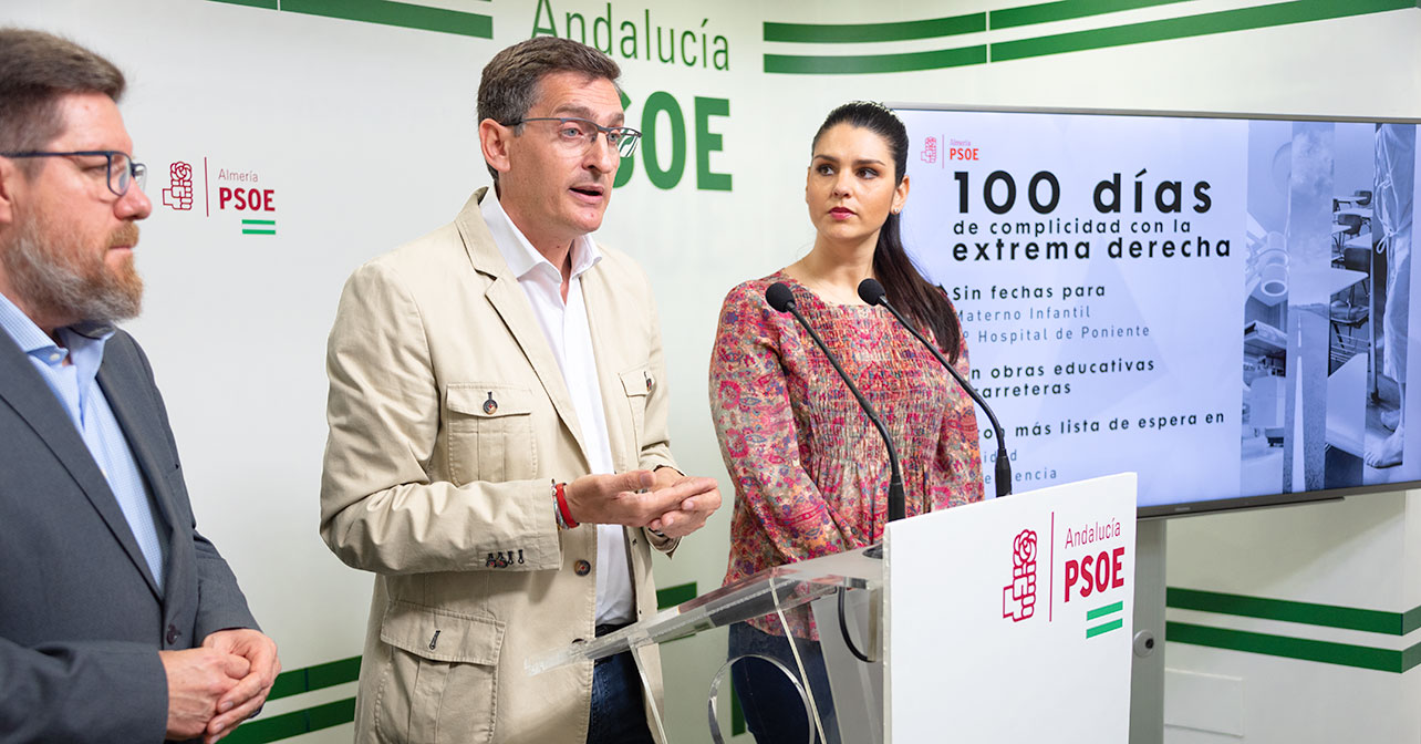 El secretario general del PSOE de Almería, José Luis Sánchez Teruel, ha valorado hoy los más de tres meses de gobierno de las derechas en Andalucía como los 100 días de “complicidad con la extrema derecha de un gobierno flojo que no tiene nada para Almería” y ha añadido que PP y Ciudadanos “no tiene aún fechas” para proyectos relevantes para esta provincia que fueron impulsados por el Gobierno socialista, tales como la apertura del Hospital Materno Infantil o el inicio del segundo hospital para Poniente ubicado en Roquetas de Mar.