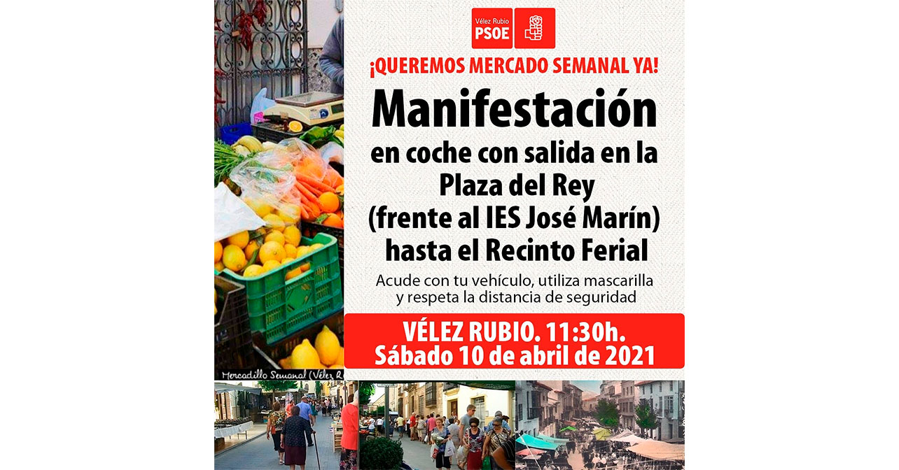 El PSOE de Vélez-Rubio ha convocado una manifestación este sábado para exigir al equipo de Gobierno Municipal de las derechas la reapertura del mercado semanal que quedó interrumpido por la pandemia pero que, pese a que las circunstancias se han modificado y que el resto de municipios cuenta ya con este servicio comercial disponible, en la localidad aún no ha sucedido pese a las reiteradas solicitudes tanto de la oposición como de la ciudadanía para su puesta en funcionamiento.